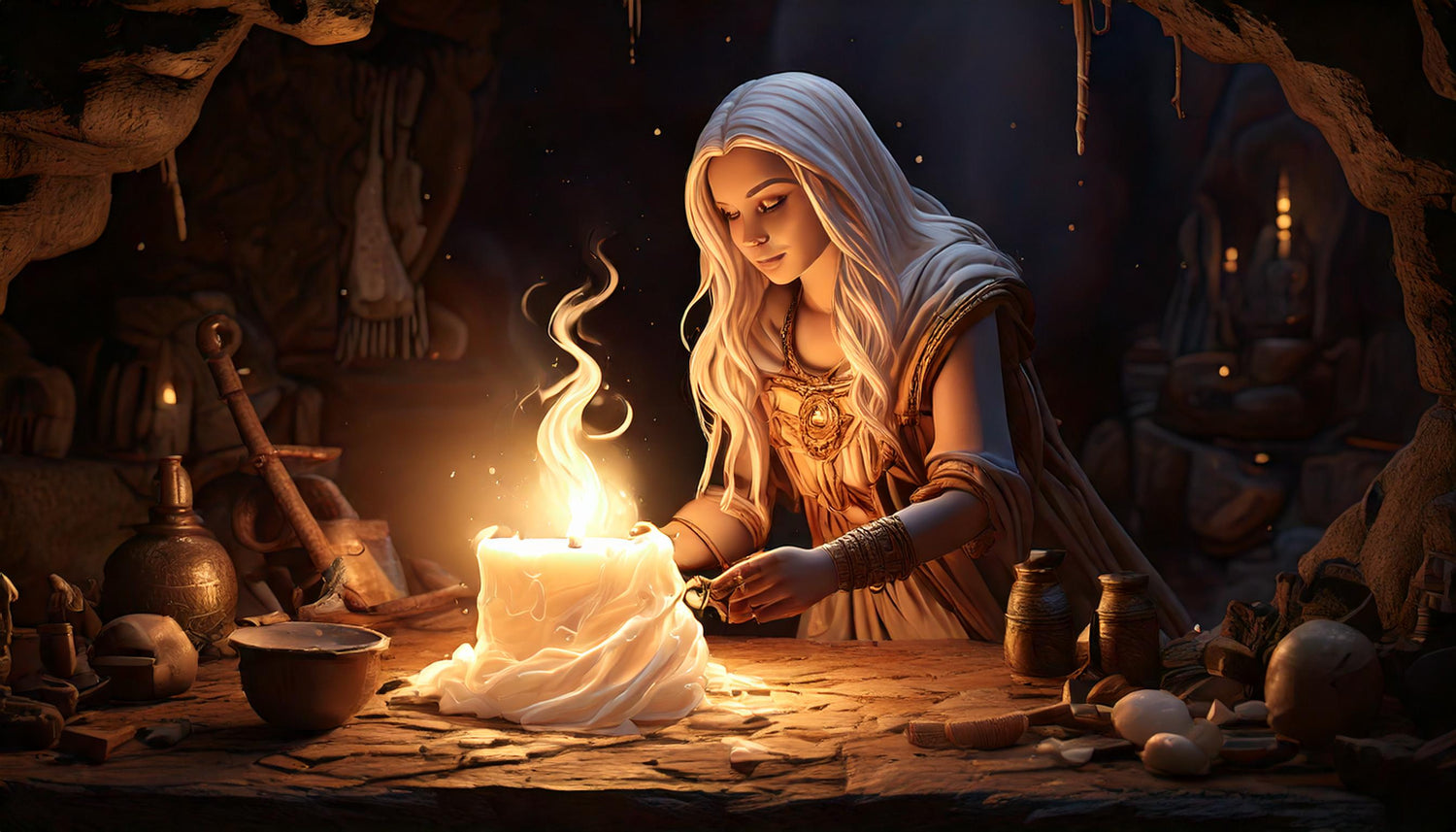 A familiar presence stirs beneath the midnight sky, the scent of aged wood and burning embers—Dancing Fireside, an ancient, flickering source of magic she has long tapped into, though she does not fully understand it. Its embers whisper in the distance, enhancing her craft, feeding magic into the fragile blossoms under her care.